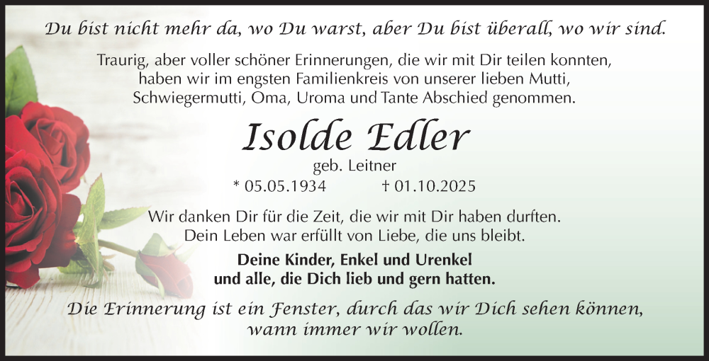 Hier finden Sie alle Traueranzeigen aus der Zeitung, die bisher für Isolde Edler erschienen sind. Weitere Traueranzeigen, die in der Zeitung erscheinen, werden hier ebenfalls aufgelistet