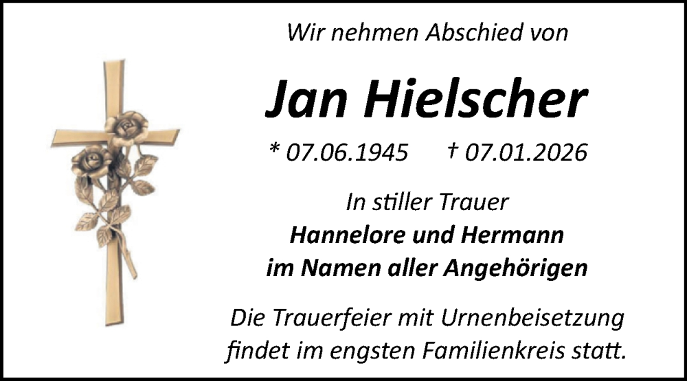 Hier finden Sie alle Traueranzeigen aus der Zeitung, die bisher für Jan Hielscher erschienen sind. Weitere Traueranzeigen, die in der Zeitung erscheinen, werden hier ebenfalls aufgelistet