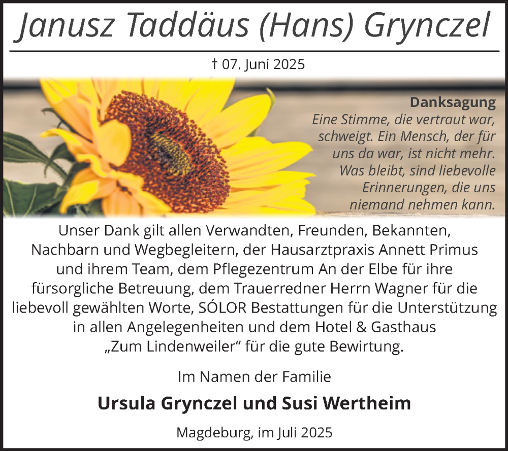 Hier finden Sie alle Traueranzeigen aus der Zeitung, die bisher für Janusz Taddäus Grynczel erschienen sind. Weitere Traueranzeigen, die in der Zeitung erscheinen, werden hier ebenfalls aufgelistet