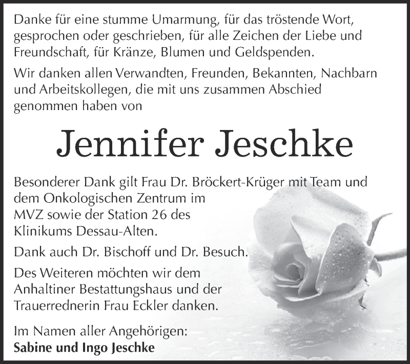 Hier finden Sie alle Traueranzeigen aus der Zeitung, die bisher für Jennifer Jeschke erschienen sind. Weitere Traueranzeigen, die in der Zeitung erscheinen, werden hier ebenfalls aufgelistet