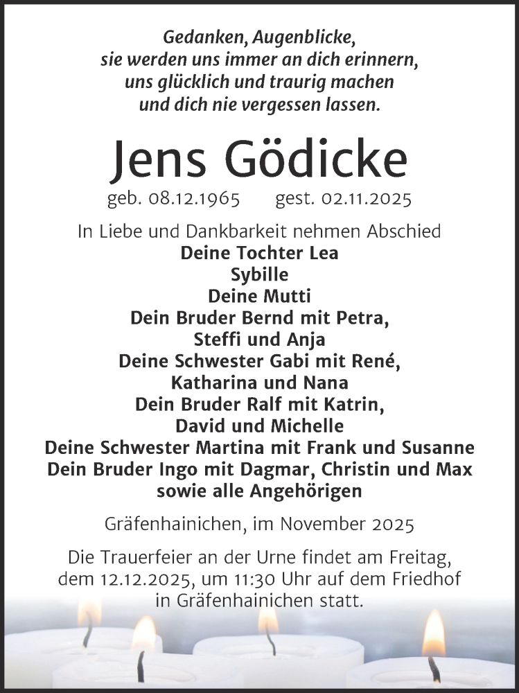 Hier finden Sie alle Traueranzeigen aus der Zeitung, die bisher für Jens Gödicke erschienen sind. Weitere Traueranzeigen, die in der Zeitung erscheinen, werden hier ebenfalls aufgelistet