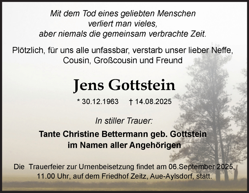 Hier finden Sie alle Traueranzeigen aus der Zeitung, die bisher für Jens Gottstein erschienen sind. Weitere Traueranzeigen, die in der Zeitung erscheinen, werden hier ebenfalls aufgelistet