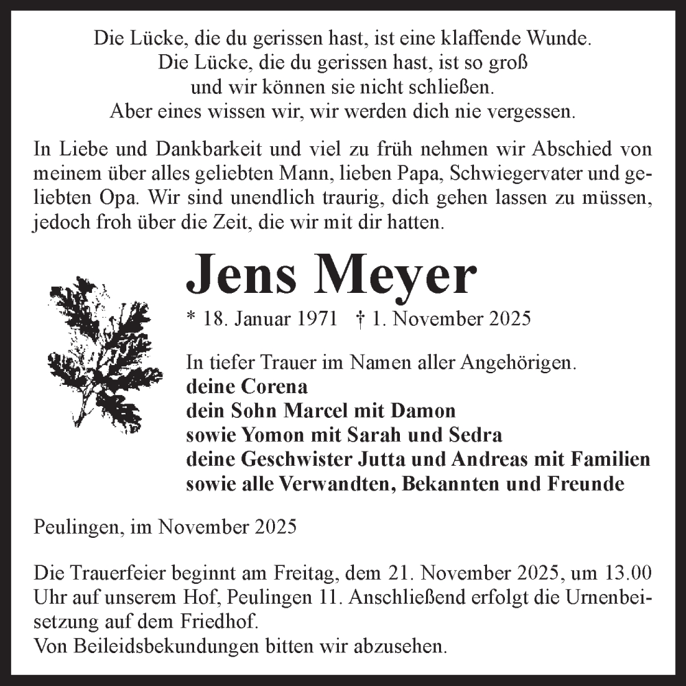 Hier finden Sie alle Traueranzeigen aus der Zeitung, die bisher für Jens Meyer erschienen sind. Weitere Traueranzeigen, die in der Zeitung erscheinen, werden hier ebenfalls aufgelistet
