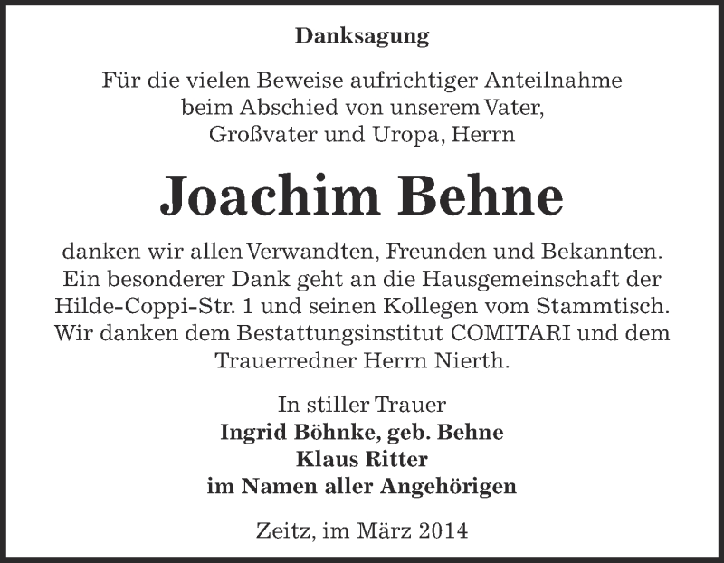 Hier finden Sie alle Traueranzeigen aus der Zeitung, die bisher für Joachim Behne erschienen sind. Weitere Traueranzeigen, die in der Zeitung erscheinen, werden hier ebenfalls aufgelistet