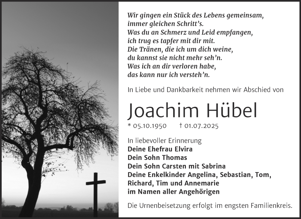 Hier finden Sie alle Traueranzeigen aus der Zeitung, die bisher für Joachim Hübel erschienen sind. Weitere Traueranzeigen, die in der Zeitung erscheinen, werden hier ebenfalls aufgelistet