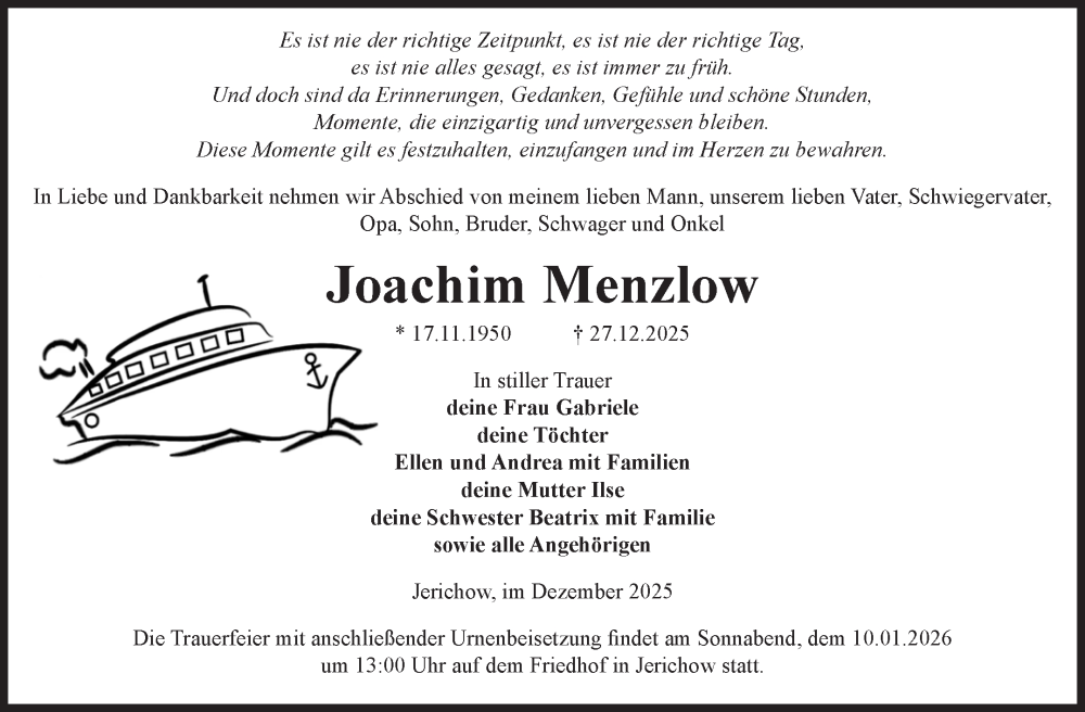 Hier finden Sie alle Traueranzeigen aus der Zeitung, die bisher für Joachim Menzlow erschienen sind. Weitere Traueranzeigen, die in der Zeitung erscheinen, werden hier ebenfalls aufgelistet