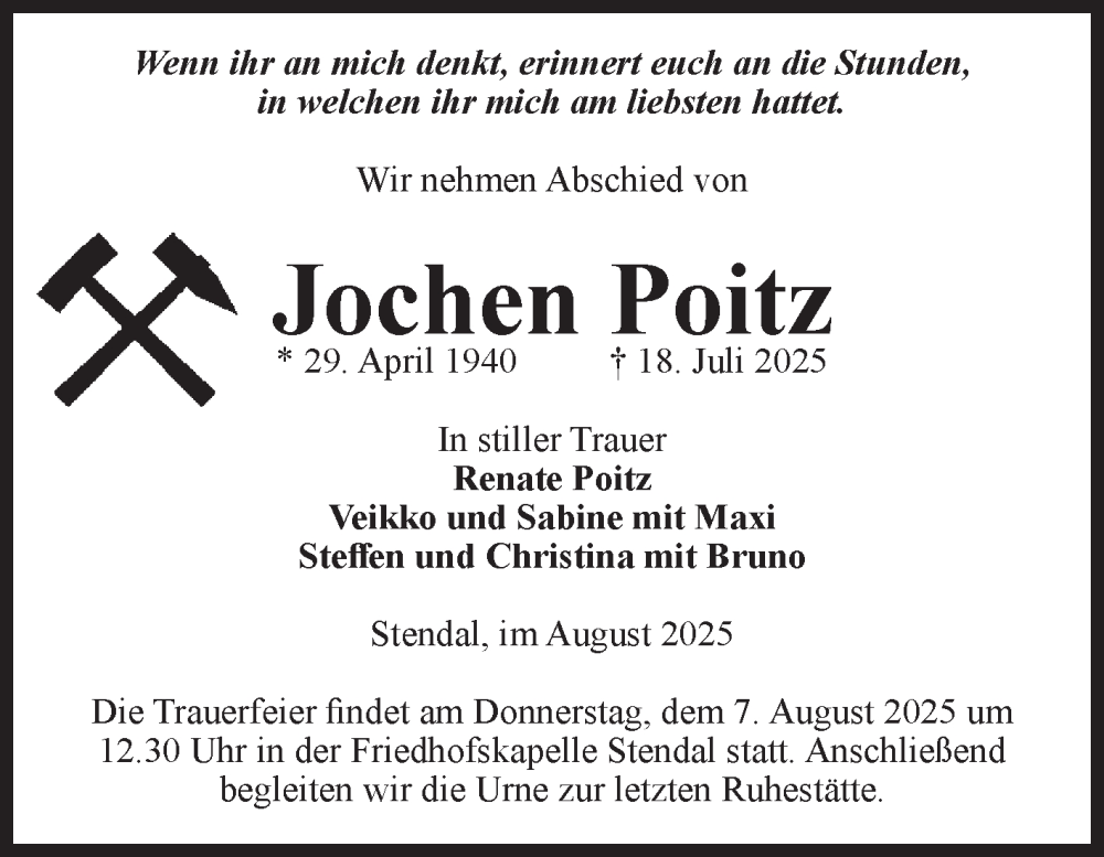 Hier finden Sie alle Traueranzeigen aus der Zeitung, die bisher für Jochen Poitz erschienen sind. Weitere Traueranzeigen, die in der Zeitung erscheinen, werden hier ebenfalls aufgelistet