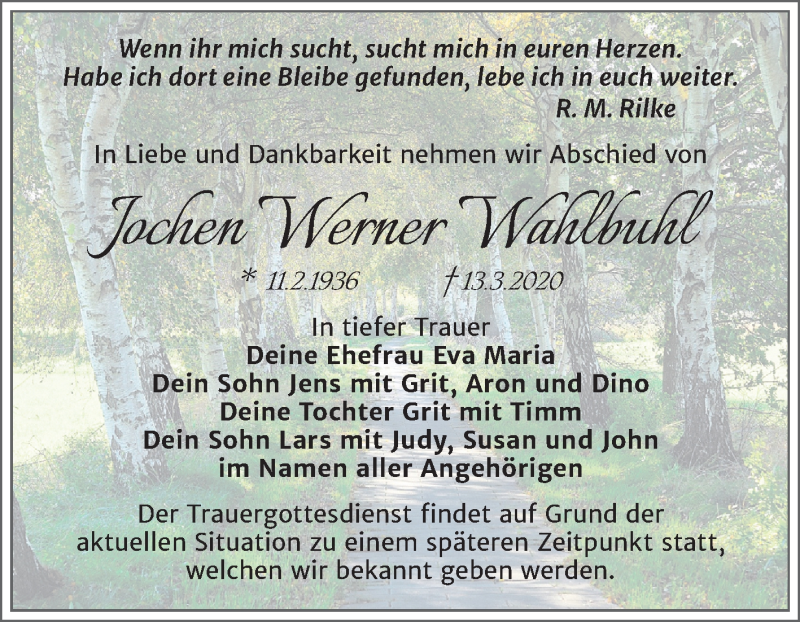 Hier finden Sie alle Traueranzeigen aus der Zeitung, die bisher für Jochen Werner Wahlbuhl erschienen sind. Weitere Traueranzeigen, die in der Zeitung erscheinen, werden hier ebenfalls aufgelistet
