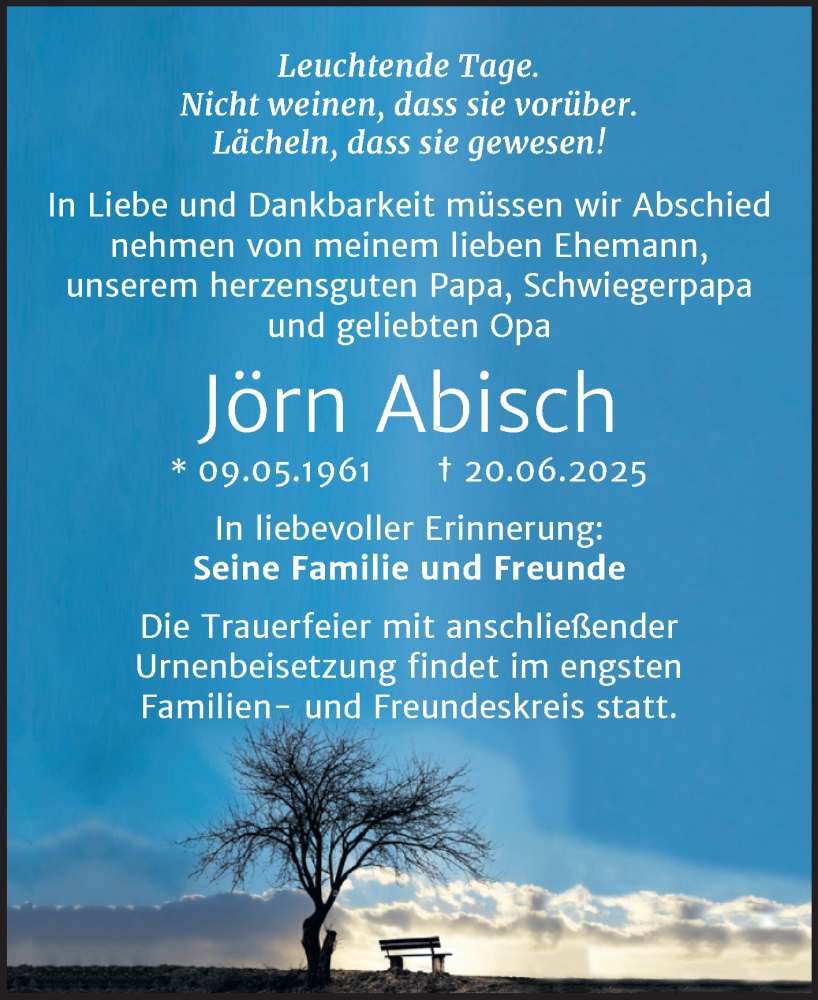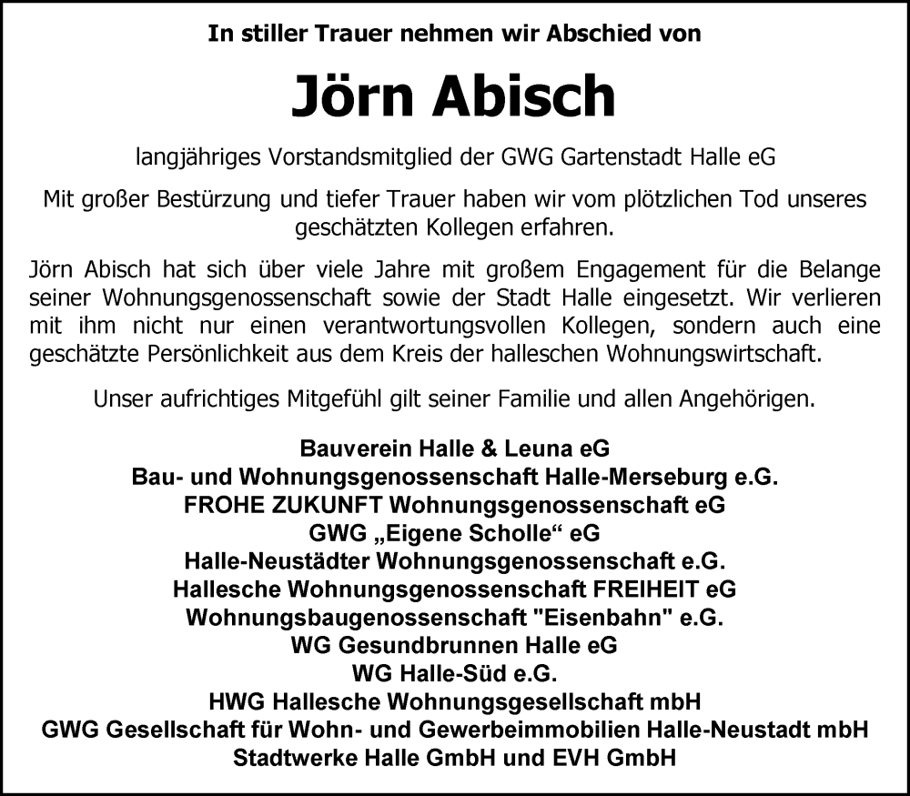 Hier finden Sie alle Traueranzeigen aus der Zeitung, die bisher für Jörn Abisch erschienen sind. Weitere Traueranzeigen, die in der Zeitung erscheinen, werden hier ebenfalls aufgelistet