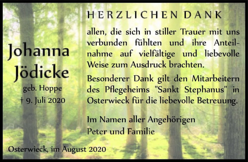 Hier finden Sie alle Traueranzeigen aus der Zeitung, die bisher für Johanna Jödicke (geb. Hoppe) erschienen sind. Weitere Traueranzeigen, die in der Zeitung erscheinen, werden hier ebenfalls aufgelistet