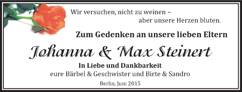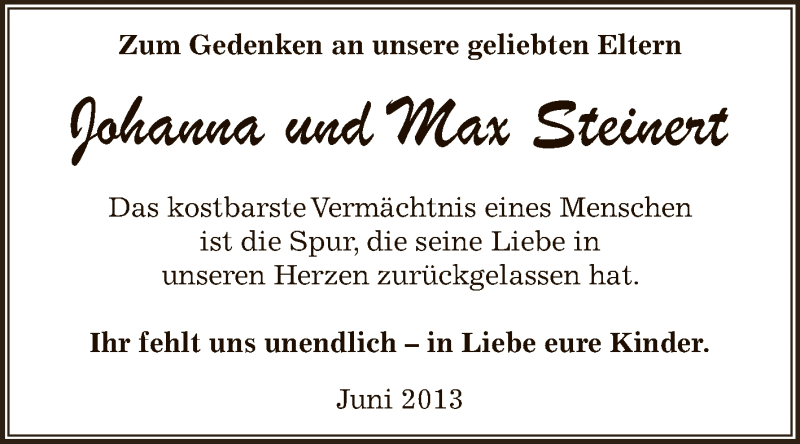 Hier finden Sie alle Traueranzeigen aus der Zeitung, die bisher für Johanna und Max Steinert erschienen sind. Weitere Traueranzeigen, die in der Zeitung erscheinen, werden hier ebenfalls aufgelistet
