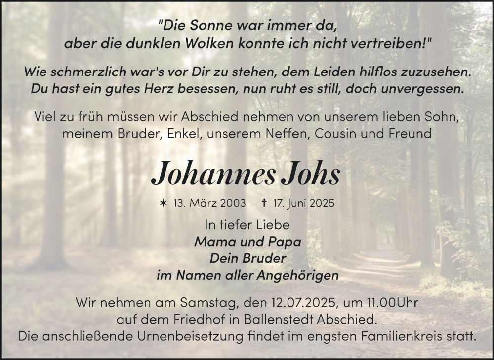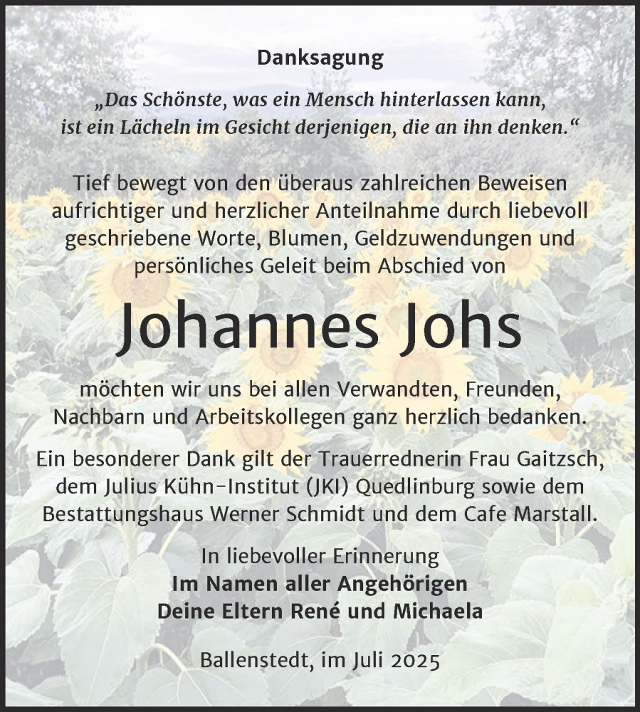 Hier finden Sie alle Traueranzeigen aus der Zeitung, die bisher für Johannes Johs erschienen sind. Weitere Traueranzeigen, die in der Zeitung erscheinen, werden hier ebenfalls aufgelistet