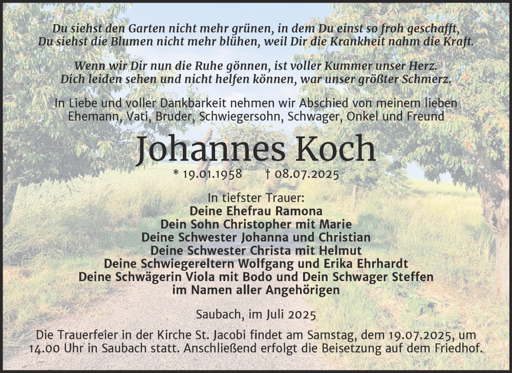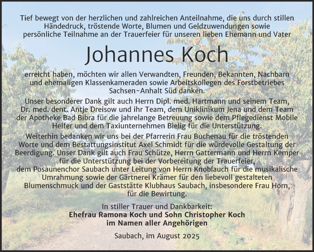 Hier finden Sie alle Traueranzeigen aus der Zeitung, die bisher für Johannes Koch erschienen sind. Weitere Traueranzeigen, die in der Zeitung erscheinen, werden hier ebenfalls aufgelistet