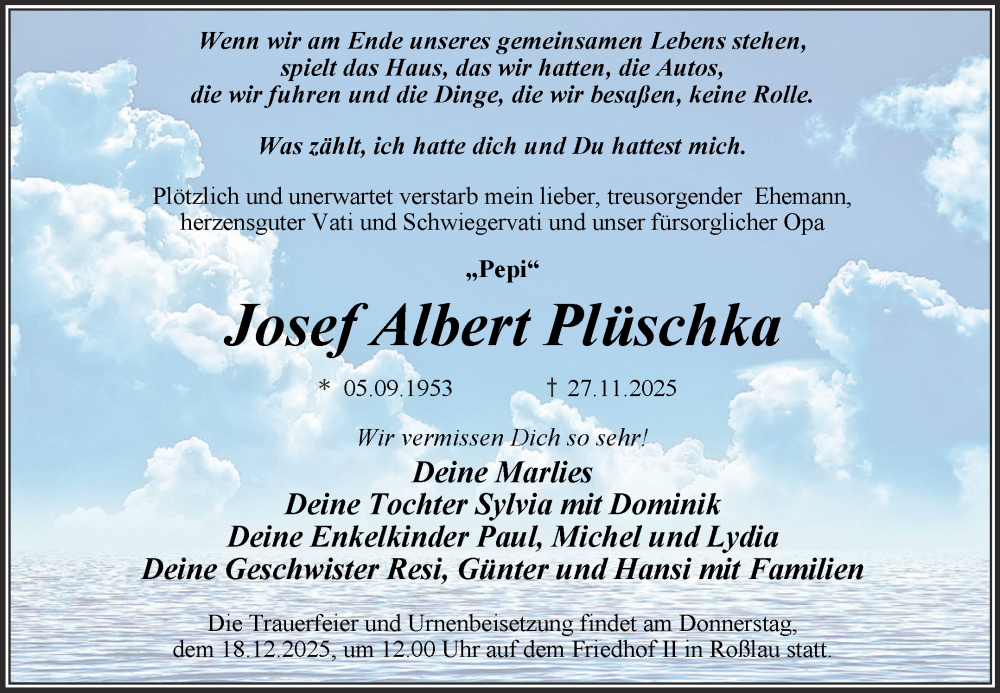 Hier finden Sie alle Traueranzeigen aus der Zeitung, die bisher für Josef Albert Plüschka erschienen sind. Weitere Traueranzeigen, die in der Zeitung erscheinen, werden hier ebenfalls aufgelistet