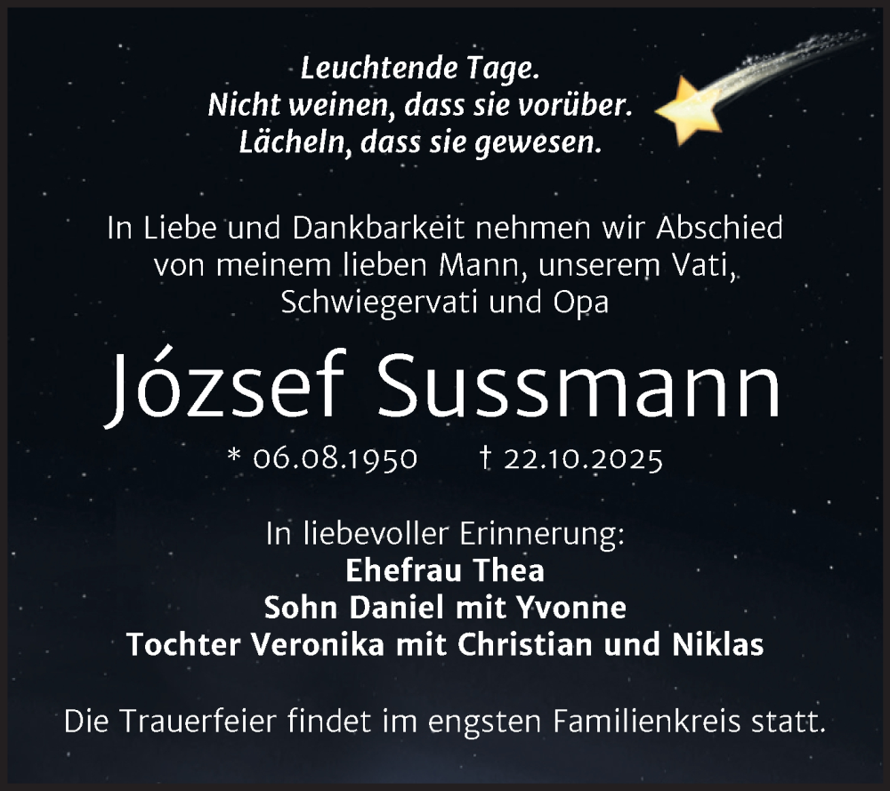 Hier finden Sie alle Traueranzeigen aus der Zeitung, die bisher für József Sussmann erschienen sind. Weitere Traueranzeigen, die in der Zeitung erscheinen, werden hier ebenfalls aufgelistet