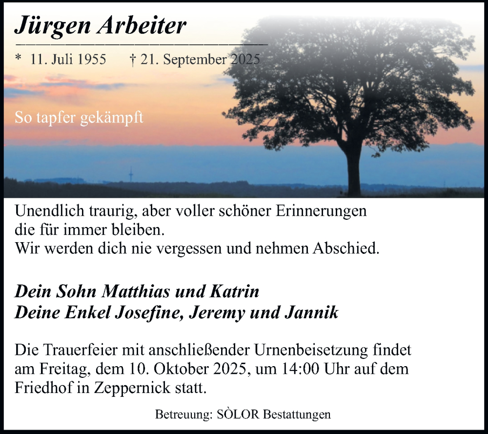 Hier finden Sie alle Traueranzeigen aus der Zeitung, die bisher für Jürgen Arbeiter erschienen sind. Weitere Traueranzeigen, die in der Zeitung erscheinen, werden hier ebenfalls aufgelistet