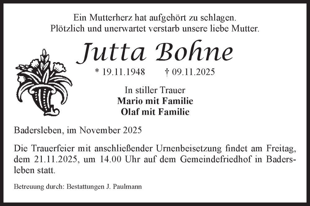 Hier finden Sie alle Traueranzeigen aus der Zeitung, die bisher für Jutta Bohne erschienen sind. Weitere Traueranzeigen, die in der Zeitung erscheinen, werden hier ebenfalls aufgelistet