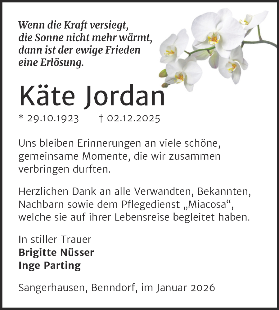 Hier finden Sie alle Traueranzeigen aus der Zeitung, die bisher für Käte Jordan erschienen sind. Weitere Traueranzeigen, die in der Zeitung erscheinen, werden hier ebenfalls aufgelistet