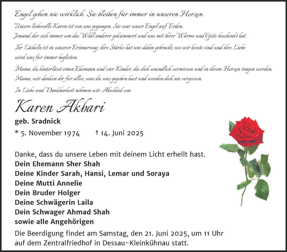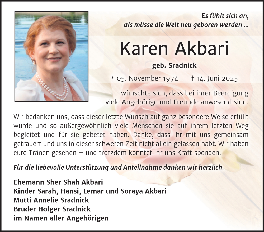 Hier finden Sie alle Traueranzeigen aus der Zeitung, die bisher für Karen Akbari erschienen sind. Weitere Traueranzeigen, die in der Zeitung erscheinen, werden hier ebenfalls aufgelistet