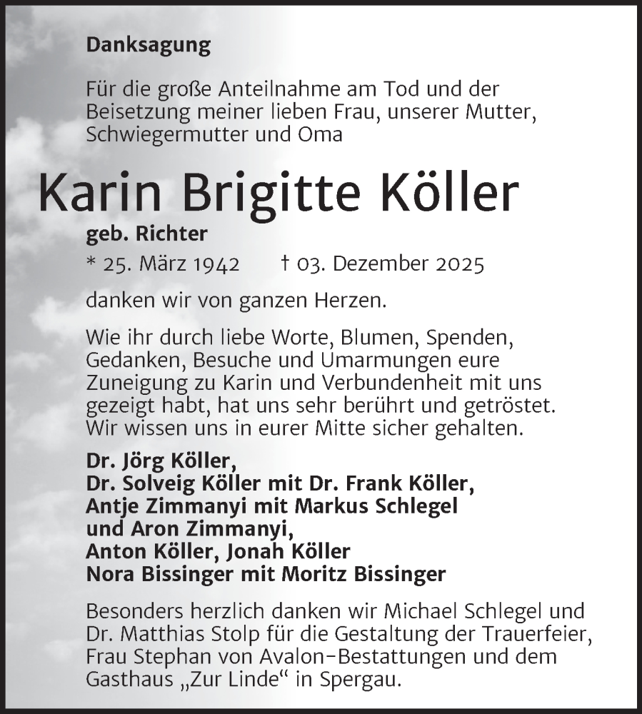 Hier finden Sie alle Traueranzeigen aus der Zeitung, die bisher für Karin Brigitte Köller erschienen sind. Weitere Traueranzeigen, die in der Zeitung erscheinen, werden hier ebenfalls aufgelistet