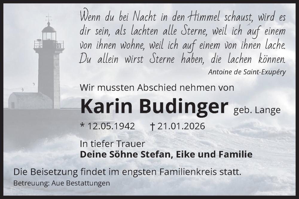 Hier finden Sie alle Traueranzeigen aus der Zeitung, die bisher für Karin Budinger erschienen sind. Weitere Traueranzeigen, die in der Zeitung erscheinen, werden hier ebenfalls aufgelistet