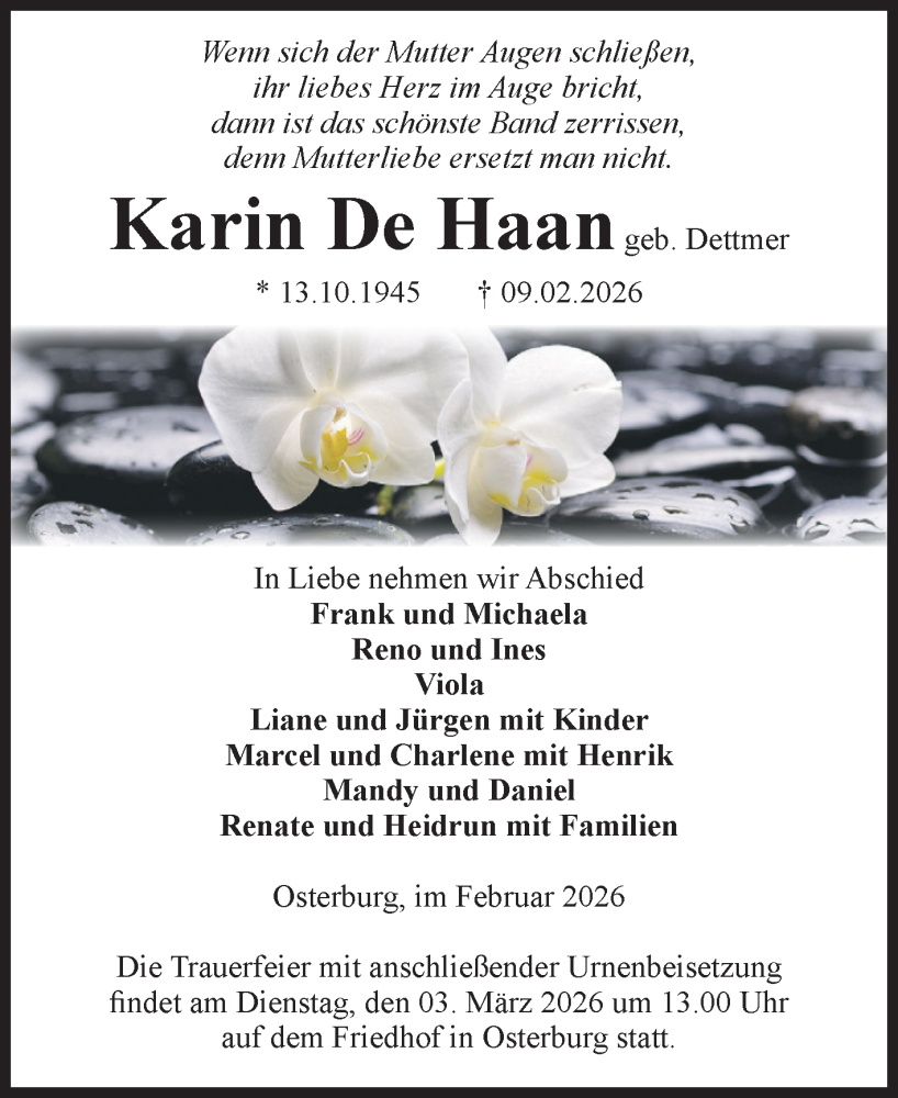 Hier finden Sie alle Traueranzeigen aus der Zeitung, die bisher für Karin De Haan erschienen sind. Weitere Traueranzeigen, die in der Zeitung erscheinen, werden hier ebenfalls aufgelistet