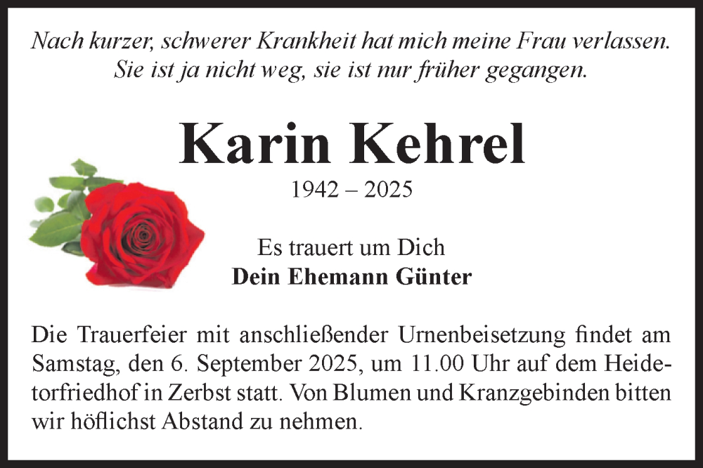 Hier finden Sie alle Traueranzeigen aus der Zeitung, die bisher für Karin Kehrel erschienen sind. Weitere Traueranzeigen, die in der Zeitung erscheinen, werden hier ebenfalls aufgelistet