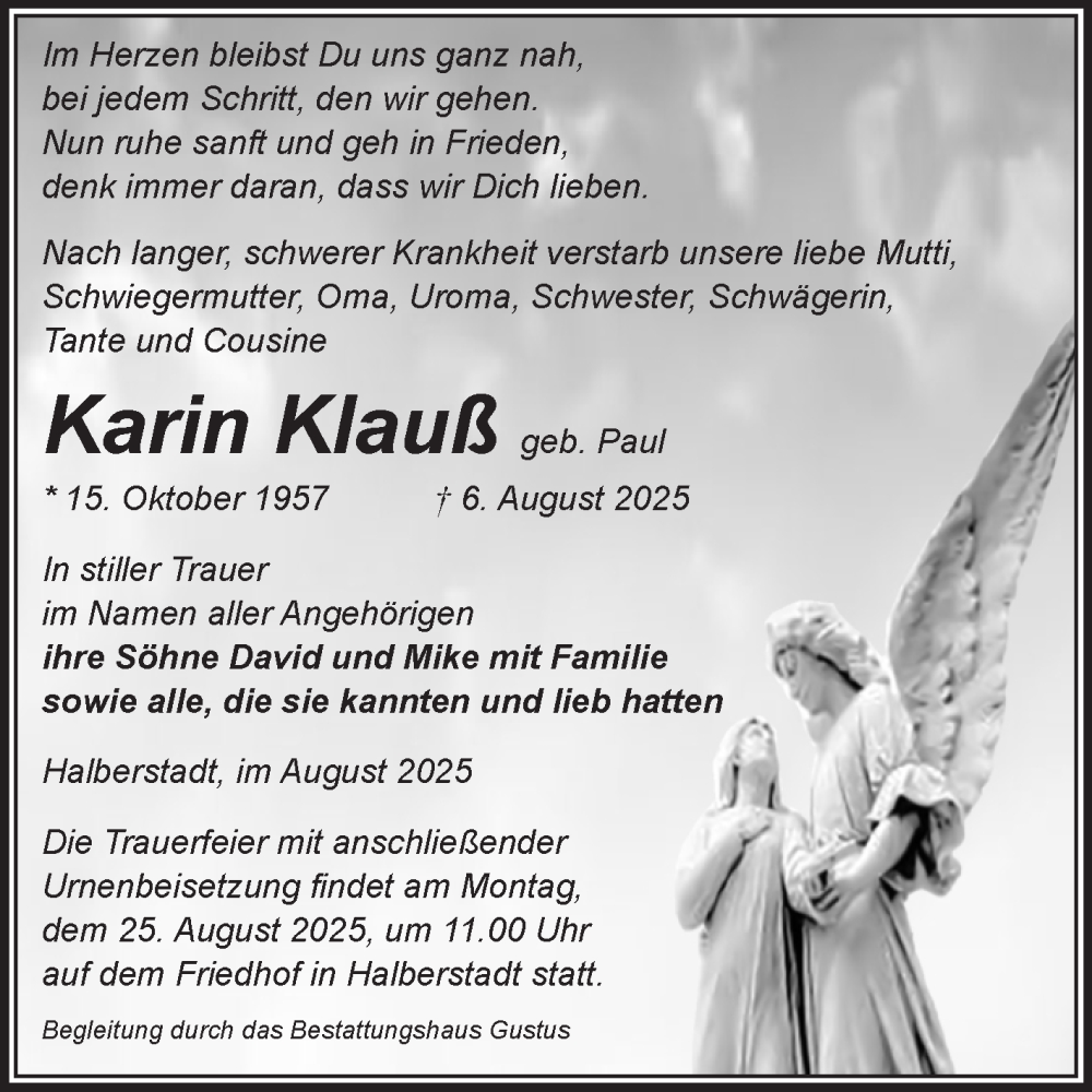 Hier finden Sie alle Traueranzeigen aus der Zeitung, die bisher für Karin Klauß erschienen sind. Weitere Traueranzeigen, die in der Zeitung erscheinen, werden hier ebenfalls aufgelistet