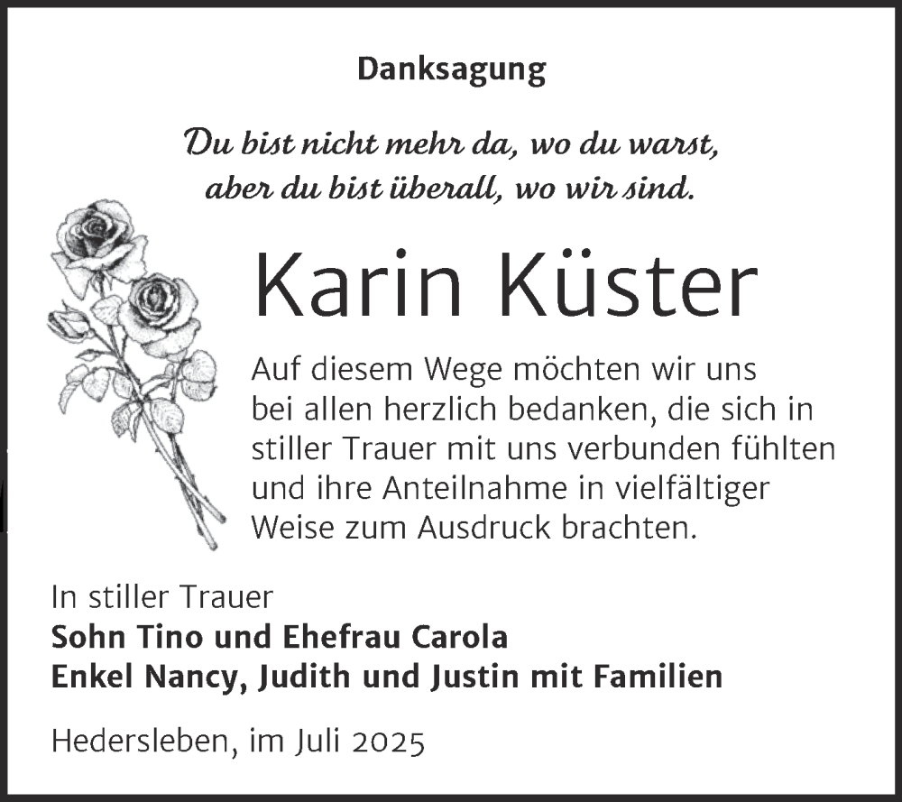 Hier finden Sie alle Traueranzeigen aus der Zeitung, die bisher für Karin Küster erschienen sind. Weitere Traueranzeigen, die in der Zeitung erscheinen, werden hier ebenfalls aufgelistet