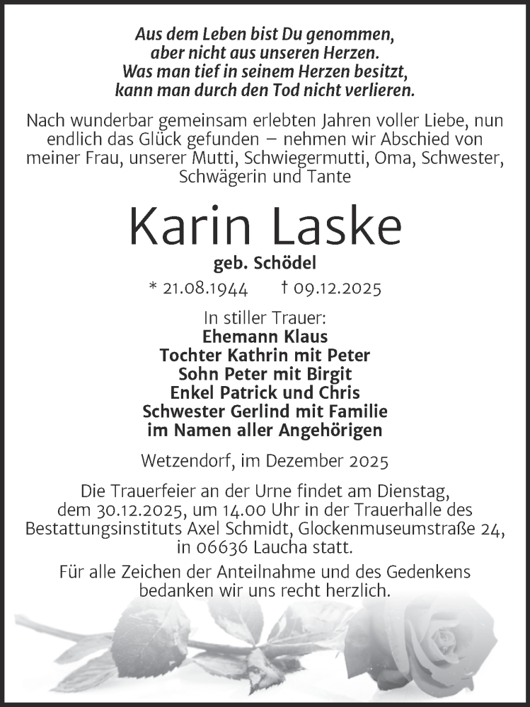 Hier finden Sie alle Traueranzeigen aus der Zeitung, die bisher für Karin Laske erschienen sind. Weitere Traueranzeigen, die in der Zeitung erscheinen, werden hier ebenfalls aufgelistet