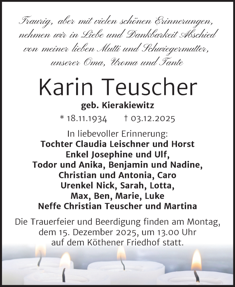 Hier finden Sie alle Traueranzeigen aus der Zeitung, die bisher für Karin Teuscher erschienen sind. Weitere Traueranzeigen, die in der Zeitung erscheinen, werden hier ebenfalls aufgelistet