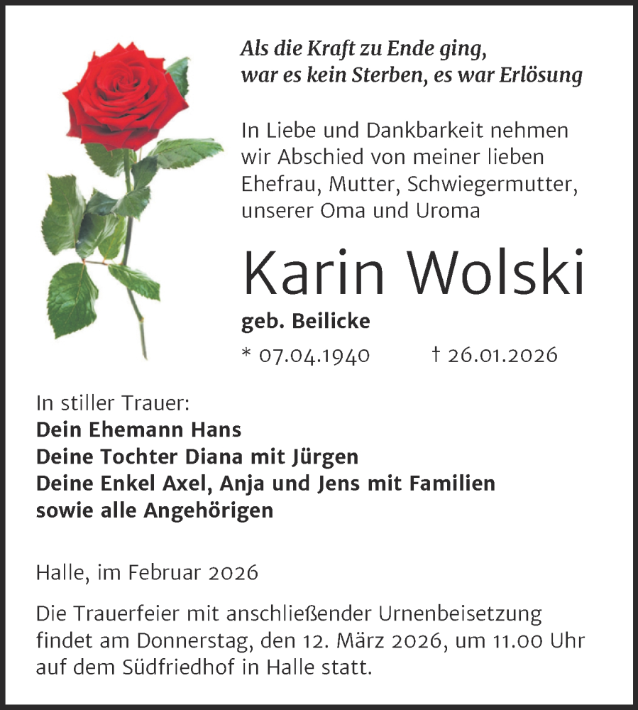 Hier finden Sie alle Traueranzeigen aus der Zeitung, die bisher für Karin Wolski erschienen sind. Weitere Traueranzeigen, die in der Zeitung erscheinen, werden hier ebenfalls aufgelistet