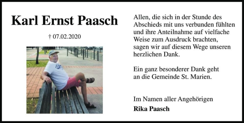 Hier finden Sie alle Traueranzeigen aus der Zeitung, die bisher für Karl Ernst Paasch erschienen sind. Weitere Traueranzeigen, die in der Zeitung erscheinen, werden hier ebenfalls aufgelistet
