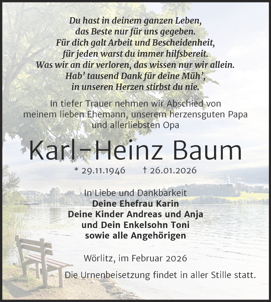 Hier finden Sie alle Traueranzeigen aus der Zeitung, die bisher für Karl-Heinz Baum erschienen sind. Weitere Traueranzeigen, die in der Zeitung erscheinen, werden hier ebenfalls aufgelistet