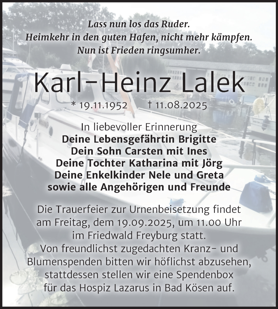 Hier finden Sie alle Traueranzeigen aus der Zeitung, die bisher für Karl-Heinz Lalek erschienen sind. Weitere Traueranzeigen, die in der Zeitung erscheinen, werden hier ebenfalls aufgelistet