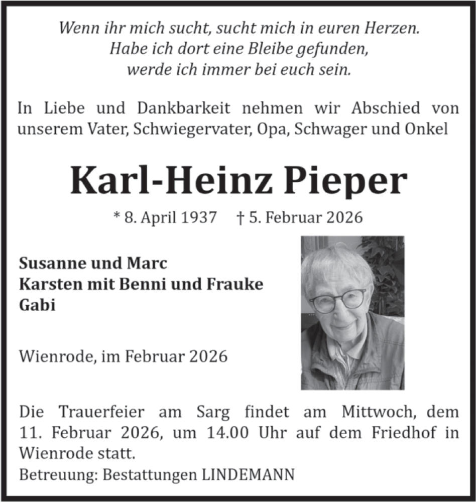 Hier finden Sie alle Traueranzeigen aus der Zeitung, die bisher für Karl-Heinz Pieper erschienen sind. Weitere Traueranzeigen, die in der Zeitung erscheinen, werden hier ebenfalls aufgelistet