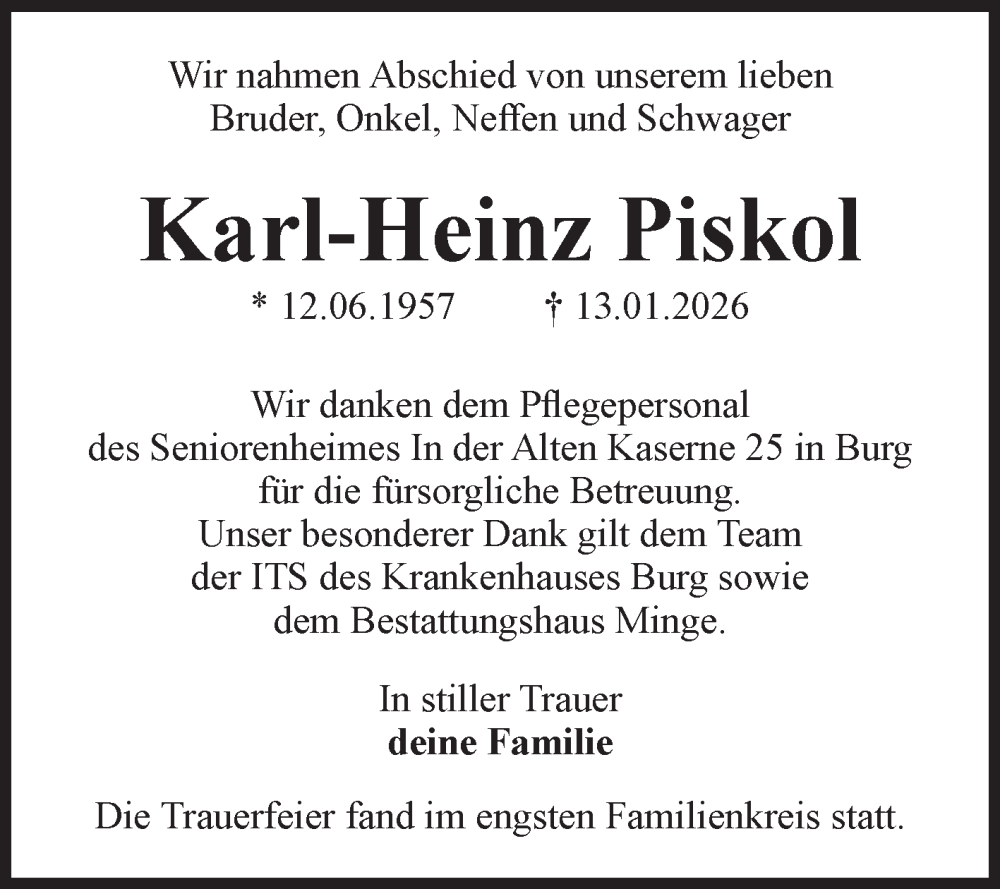 Hier finden Sie alle Traueranzeigen aus der Zeitung, die bisher für Karl-Heinz Piskol erschienen sind. Weitere Traueranzeigen, die in der Zeitung erscheinen, werden hier ebenfalls aufgelistet