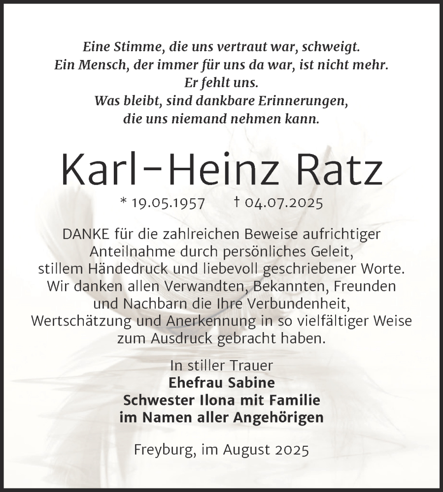 Hier finden Sie alle Traueranzeigen aus der Zeitung, die bisher für Karl-Heinz Ratz erschienen sind. Weitere Traueranzeigen, die in der Zeitung erscheinen, werden hier ebenfalls aufgelistet
