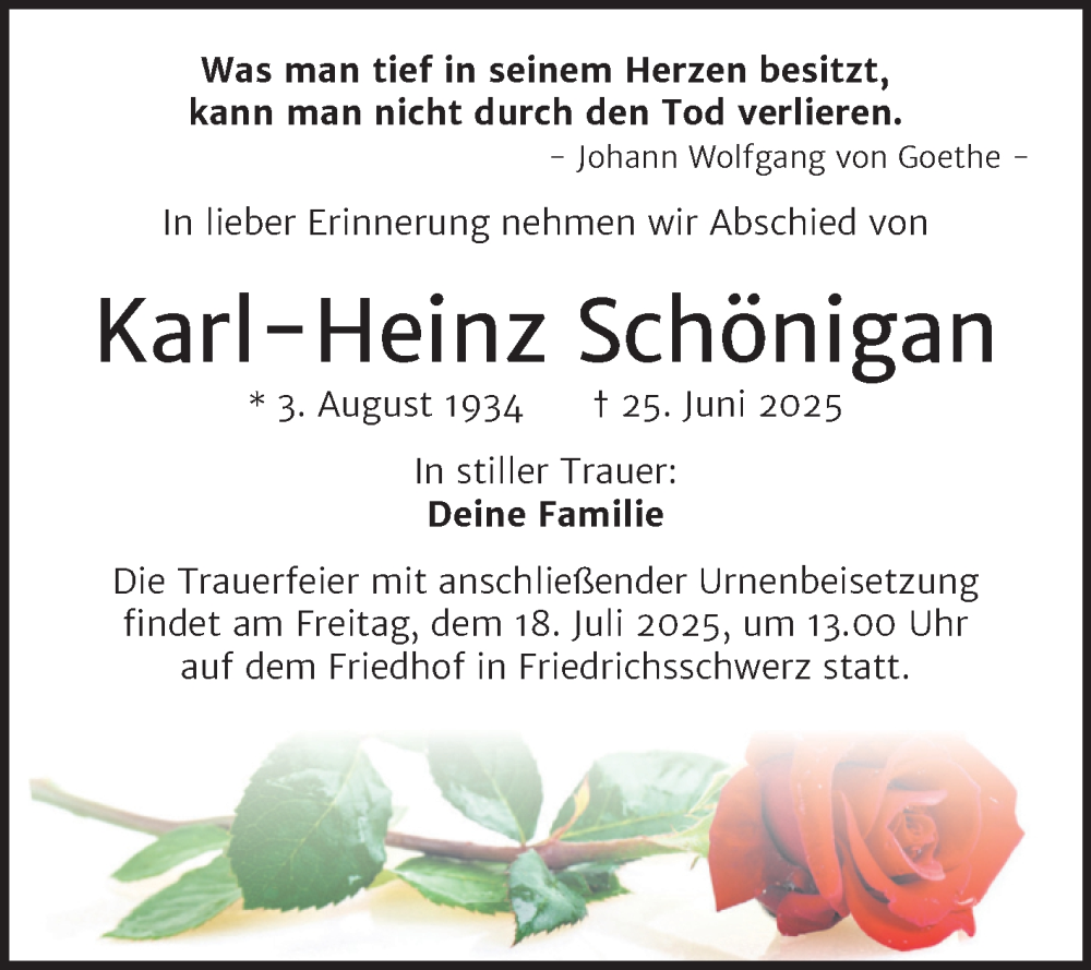 Hier finden Sie alle Traueranzeigen aus der Zeitung, die bisher für Karl-Heinz Schönigan erschienen sind. Weitere Traueranzeigen, die in der Zeitung erscheinen, werden hier ebenfalls aufgelistet