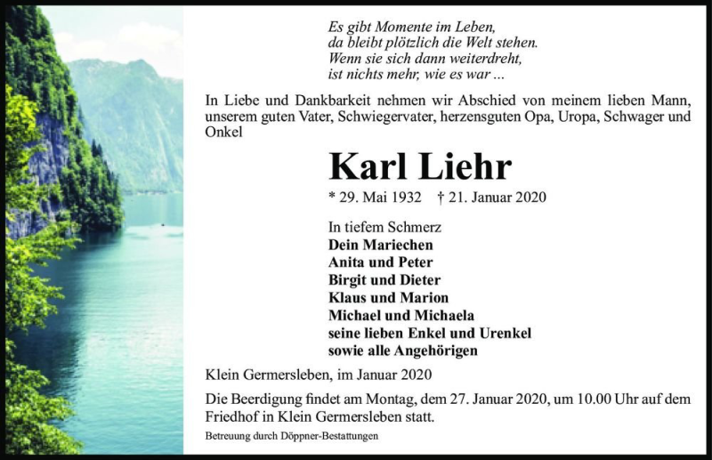 Hier finden Sie alle Traueranzeigen aus der Zeitung, die bisher für Karl Liehr erschienen sind. Weitere Traueranzeigen, die in der Zeitung erscheinen, werden hier ebenfalls aufgelistet
