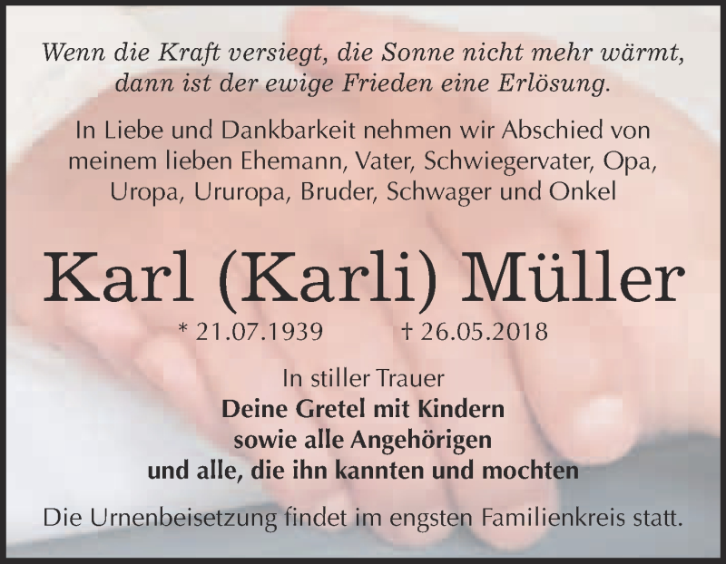 Hier finden Sie alle Traueranzeigen aus der Zeitung, die bisher für Karl Müller erschienen sind. Weitere Traueranzeigen, die in der Zeitung erscheinen, werden hier ebenfalls aufgelistet