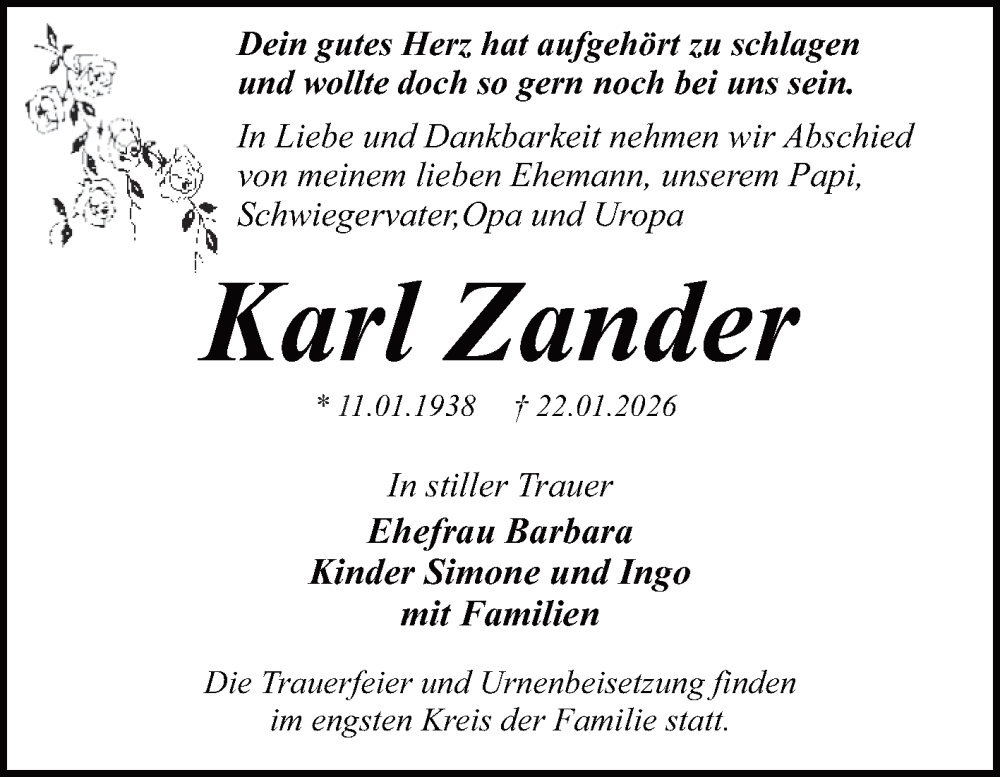 Hier finden Sie alle Traueranzeigen aus der Zeitung, die bisher für Karl Zander erschienen sind. Weitere Traueranzeigen, die in der Zeitung erscheinen, werden hier ebenfalls aufgelistet