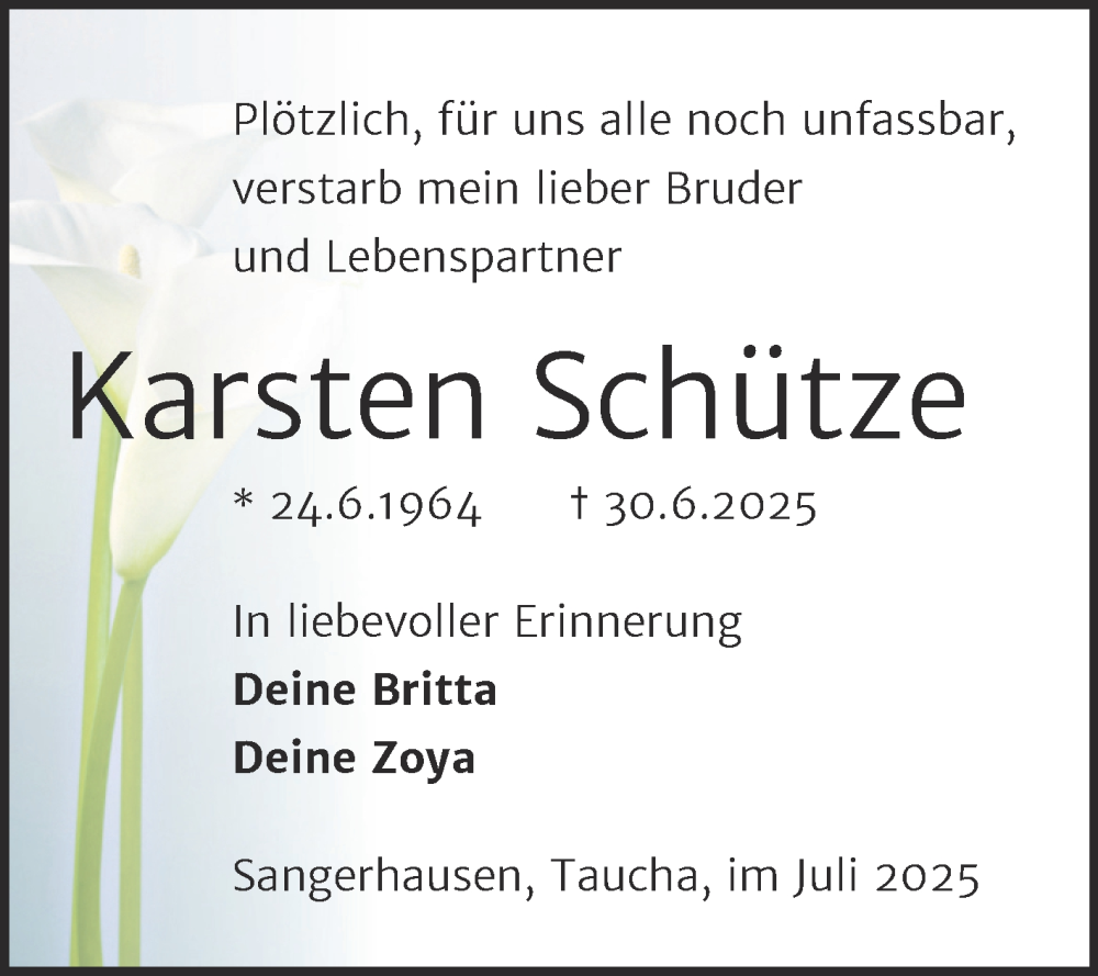 Hier finden Sie alle Traueranzeigen aus der Zeitung, die bisher für Karsten Schütze erschienen sind. Weitere Traueranzeigen, die in der Zeitung erscheinen, werden hier ebenfalls aufgelistet