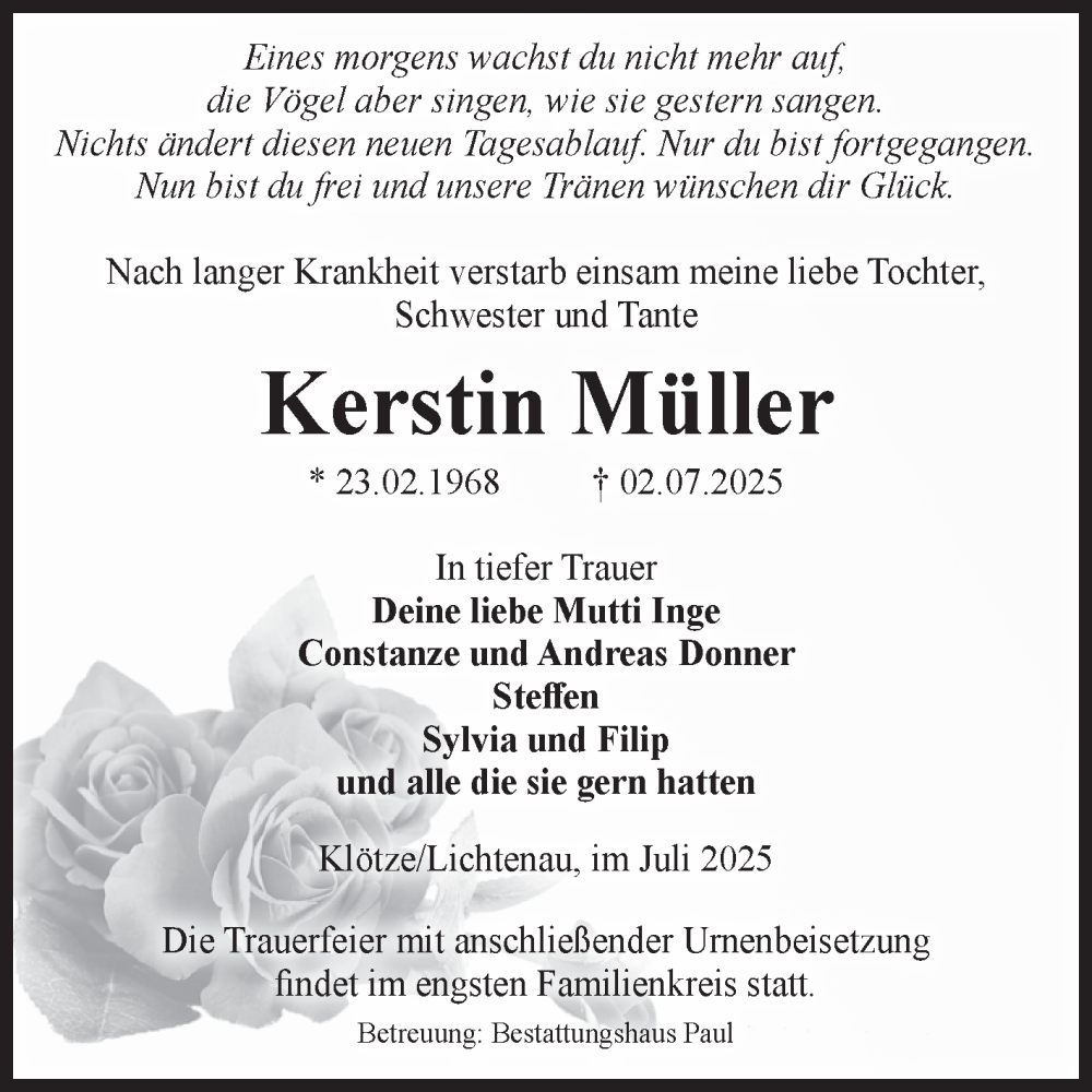 Hier finden Sie alle Traueranzeigen aus der Zeitung, die bisher für Kerstin Müller erschienen sind. Weitere Traueranzeigen, die in der Zeitung erscheinen, werden hier ebenfalls aufgelistet