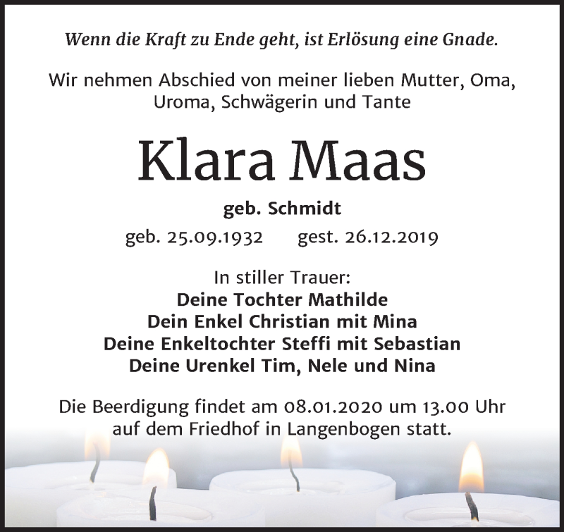 Hier finden Sie alle Traueranzeigen aus der Zeitung, die bisher für Klara Maas erschienen sind. Weitere Traueranzeigen, die in der Zeitung erscheinen, werden hier ebenfalls aufgelistet
