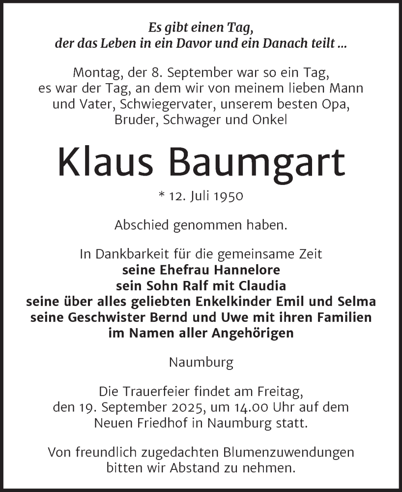 Hier finden Sie alle Traueranzeigen aus der Zeitung, die bisher für Klaus Baumgart erschienen sind. Weitere Traueranzeigen, die in der Zeitung erscheinen, werden hier ebenfalls aufgelistet
