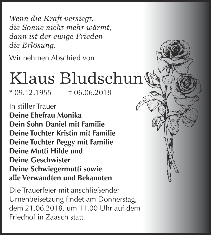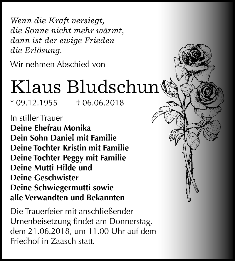 Hier finden Sie alle Traueranzeigen aus der Zeitung, die bisher für Klaus Bludschun erschienen sind. Weitere Traueranzeigen, die in der Zeitung erscheinen, werden hier ebenfalls aufgelistet