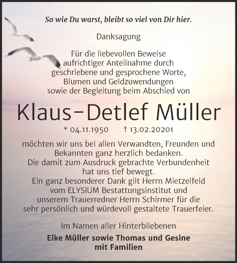 Hier finden Sie alle Traueranzeigen aus der Zeitung, die bisher für Klaus-Detlef Müller erschienen sind. Weitere Traueranzeigen, die in der Zeitung erscheinen, werden hier ebenfalls aufgelistet