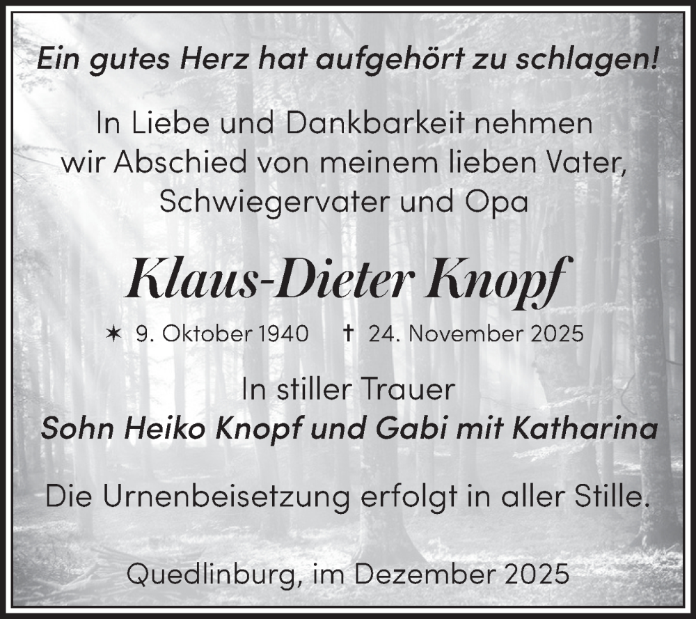 Hier finden Sie alle Traueranzeigen aus der Zeitung, die bisher für Klaus-Dieter Knopf erschienen sind. Weitere Traueranzeigen, die in der Zeitung erscheinen, werden hier ebenfalls aufgelistet