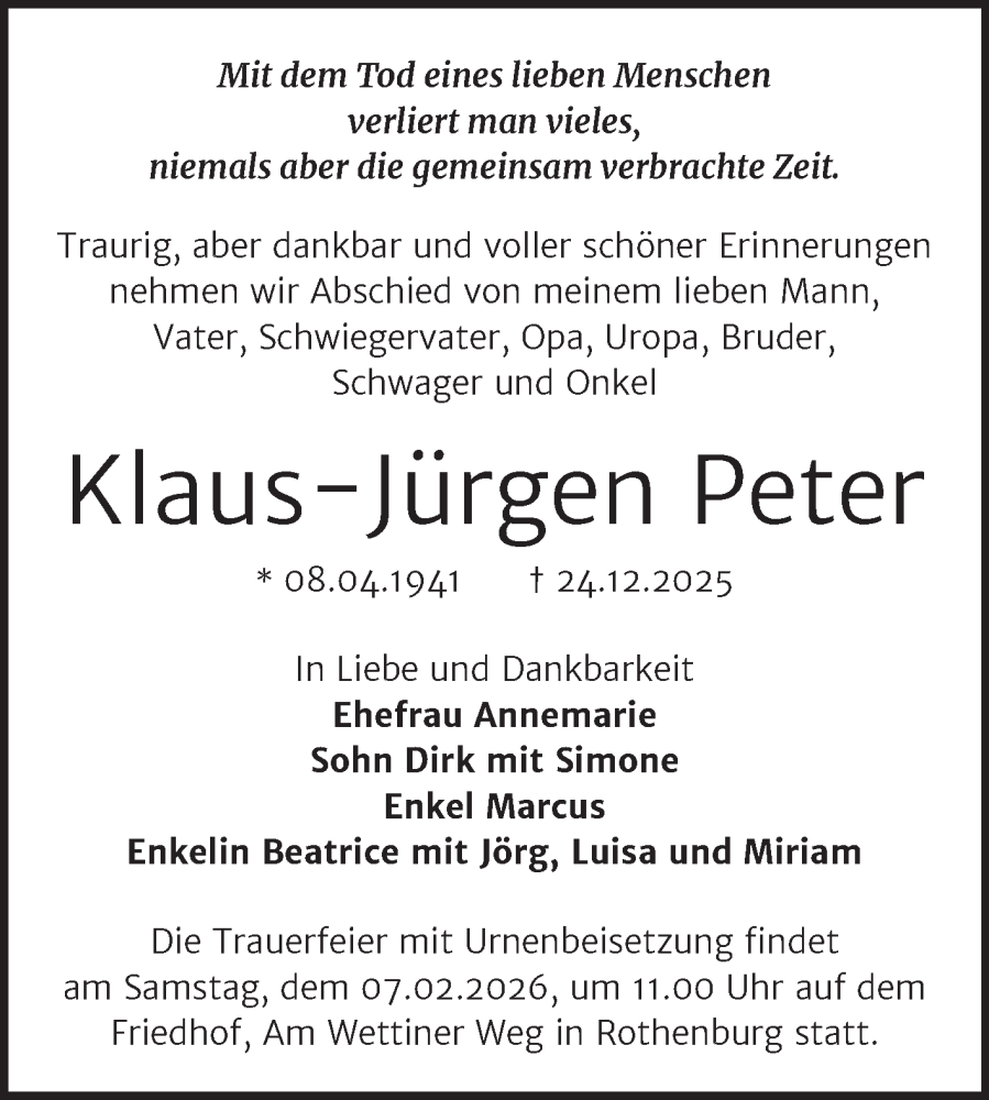 Hier finden Sie alle Traueranzeigen aus der Zeitung, die bisher für Klaus-Jürgen Peter erschienen sind. Weitere Traueranzeigen, die in der Zeitung erscheinen, werden hier ebenfalls aufgelistet